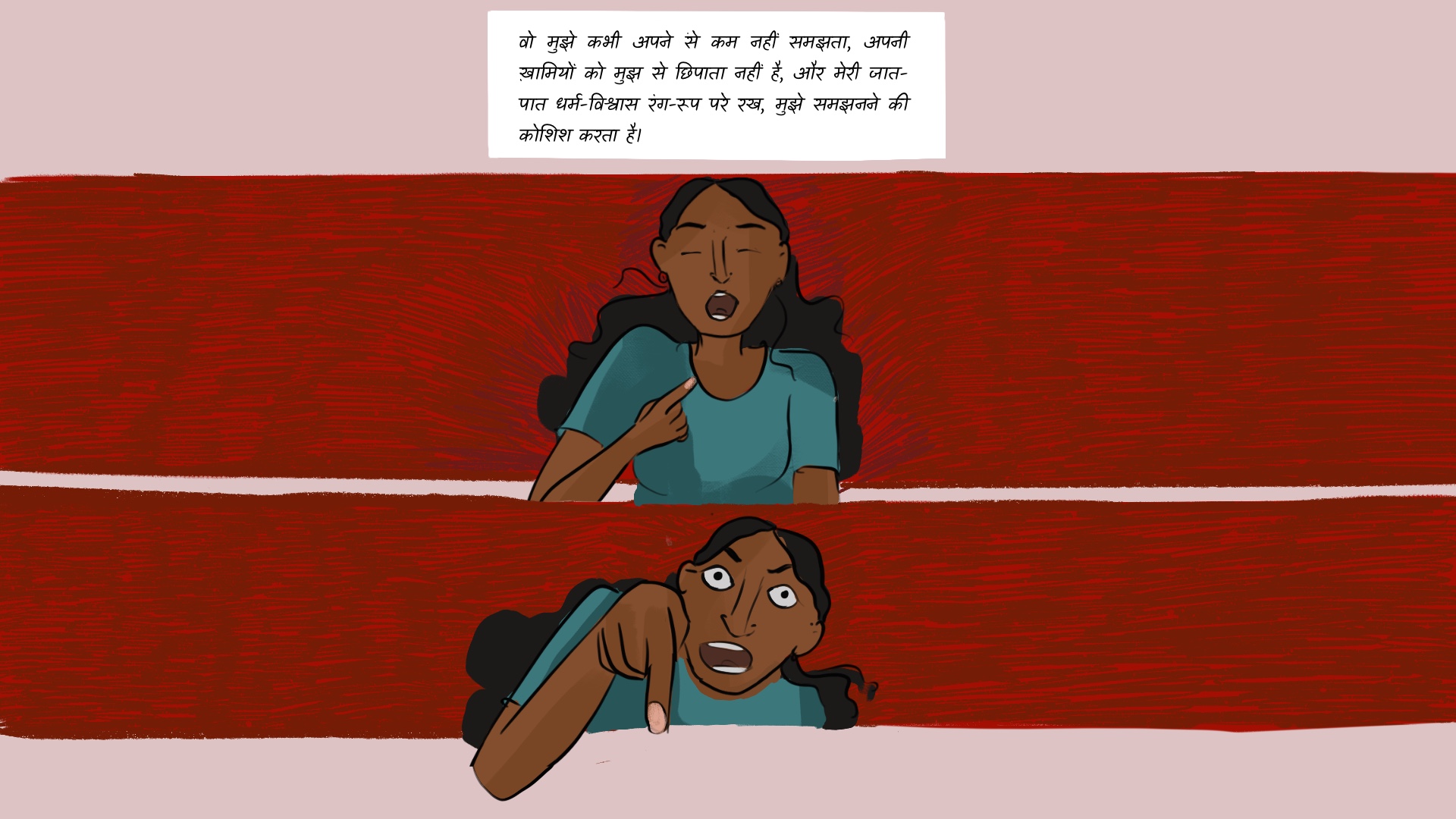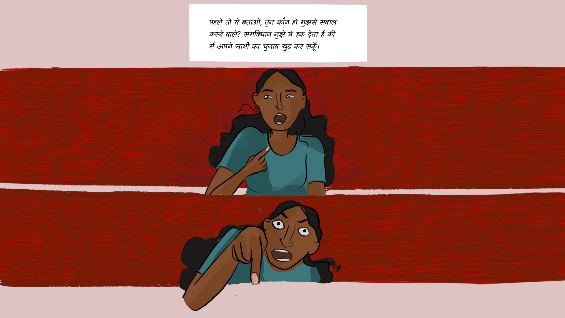 इमांशु और उसके दोस्त साक्षी को उसके परिवार के सम्मान को ठेस पहुंचाने की धमकी देते हैं, जिसका इस्तेमाल उसके सामाजिक जीवन को प्रतिबंधित करने और उनकी यथास्थिति बनाए रखने के लिए किया जाएगा। युवा उच्च जाति के लड़कों द्वारा अपने परिवार को व्यक्तिगत रूप से संबोधित किए बिना साक्षी पर आरोप लगाना ठीक माना जाता है, क्योंकि उनका मानना है कि वह उच्च जाति की स्थिति को बनाए रखने का भार वहन करती है। अभद्र भाषा का प्रयोग करके वे अपने अधिकार का प्रदर्शन करते हैं और साक्षी को याद दिलाते हैं कि एक उत्पीड़ित जाति के लड़के के साथ शामिल होने से केवल उनके समुदाय का अपमान होगा और जाट लड़कों की मर्दानगी को उनके समुदाय की महिलाओं को उनके साथ सामूहीकरण करने की अनुमति मिलेगी।
