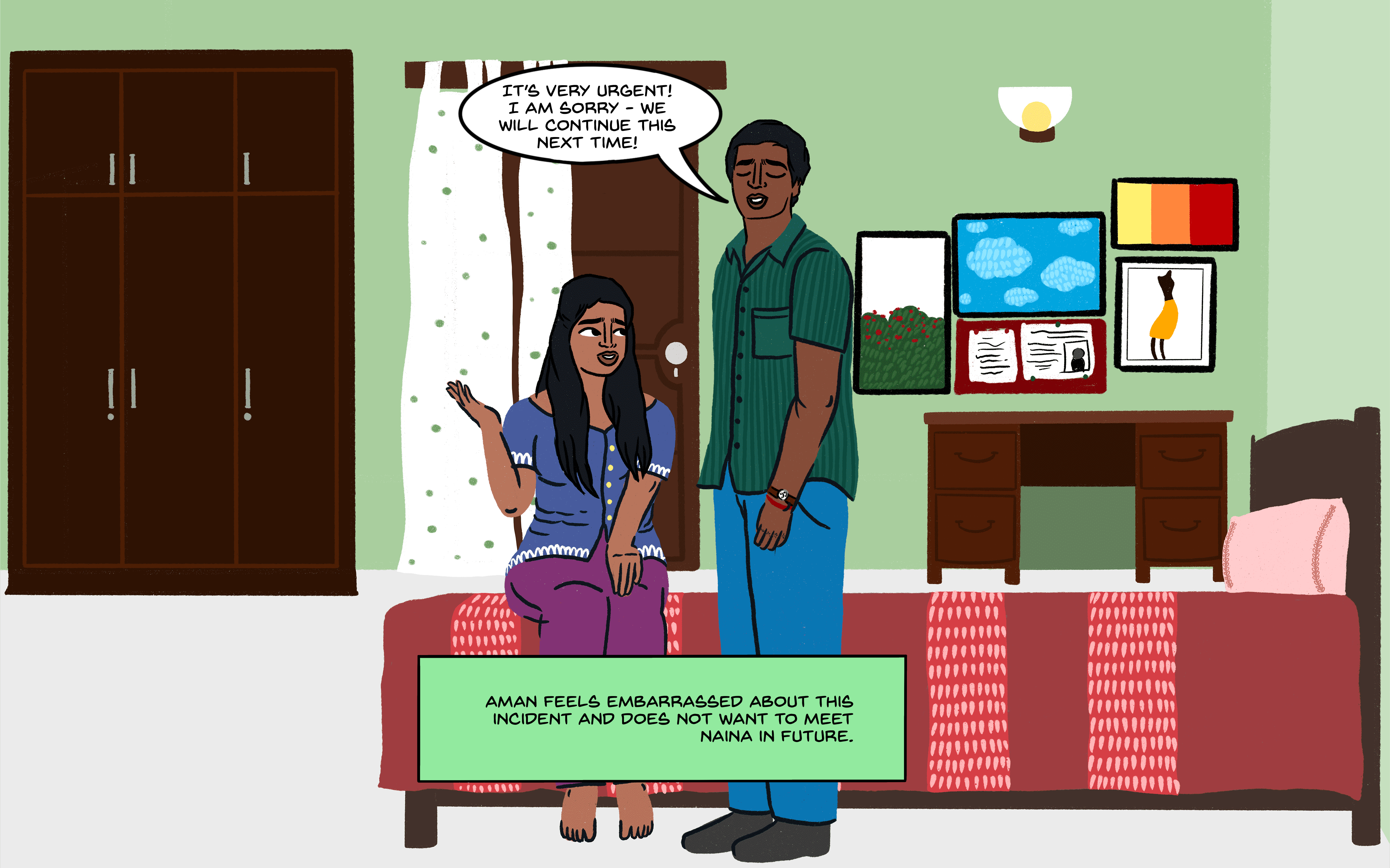 It is completely normal and understandable for men to not be in the mood, or not feel ready for sex or physical intimacy. However, men are often shamed and bullied by other men if they express discomfort or unwillingness to engage in sex. This might be the reason for Aman to make an excuse and get out of this situation, instead of openly communicating his discomfort to Naina. Does not wanting to have sex make Aman less of a man?