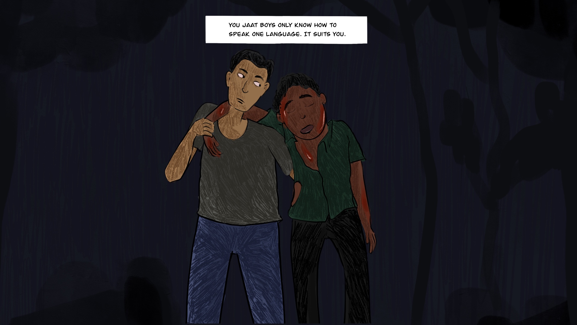Denying Ajit’s right to love through violence displays a collective act of manhood. By proposing a non-violent solution, Himanshu risks himself from other Jatt boys as he does not agree with their backward views. Maybe Himanshu alone can’t influence the situation because he does not know how to respond to their ideals of systemic discrimination but believes a resolution can be achieved through conversation. This challenges upper caste power and violence through progressive dialogue.